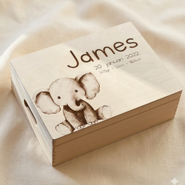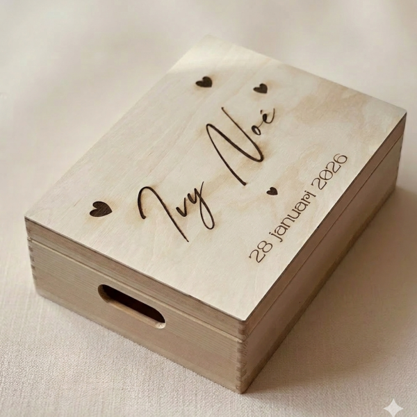 Je mag natuurlijk iedere afbeelding en tekst kiezen die je wilt, ga hiervoor naar ” Geboortebox eigen ontwerp” of kies dit leuke standaard design en pas de naam/lettertype aan. Je ontvangt altijd eerst een voorbeeld per mail/whatsapp, pas na akkoord ga ik de box voor je graveren!